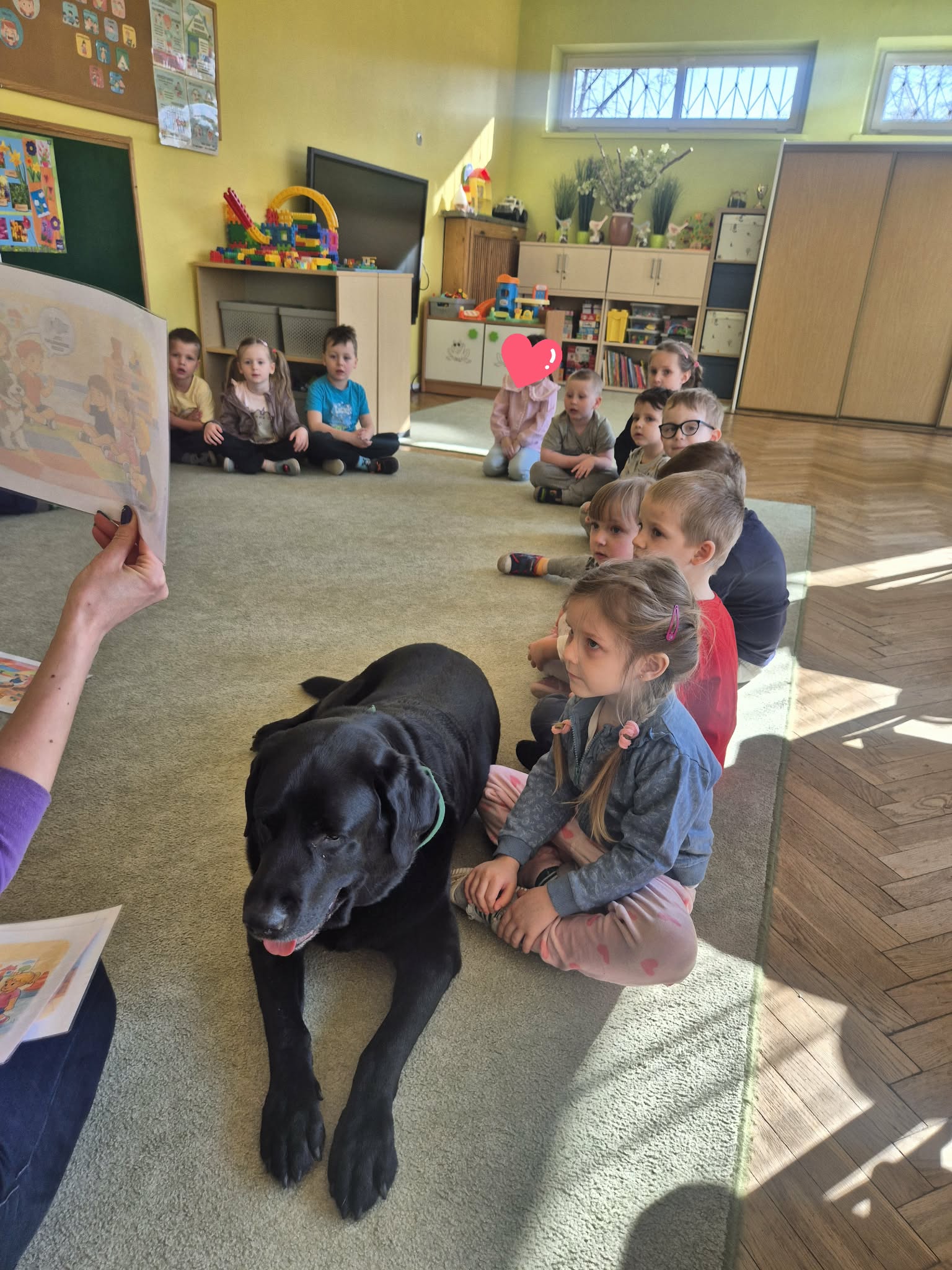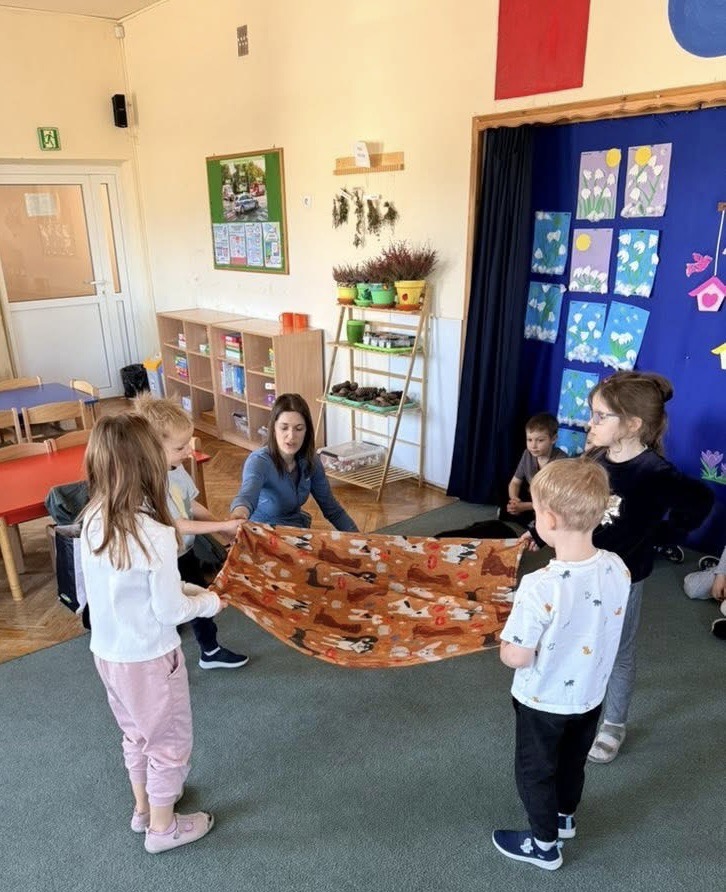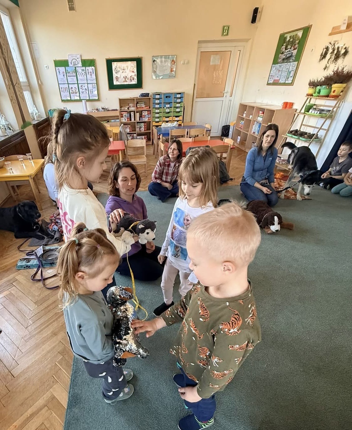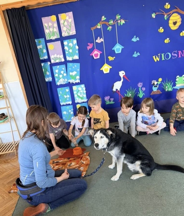 W naszym przedszkolu odbyły się wyjątkowe zajęcia z dogoterapii, które dostarczyły dzieciom wielu radości i niezapomnianych wrażeń. Podczas spotkania przedszkolaki miały okazję poznać specjalnie wyszkolone psy terapeutycznego oraz dowiedzieć się, na czym polega ich praca. W trakcie zajęć dzieci uczyły się, jak prawidłowo i bezpiecznie zachowywać się w obecności psa, jak go głaskać oraz w jaki sposób nawiązać z nim kontakt. Nie zabrakło również wspólnych zabaw, prostych ćwiczeń i zadań, które rozwijały u dzieci empatię, odpowiedzialność oraz wrażliwość na potrzeby zwierząt. Spotkanie z psami terapeutycznymi było dla przedszkolaków nie tylko świetną zabawą, ale także cenną lekcją, która pokazała, jak zwierzęta mogą wspierać rozwój człowieka i pomagać w budowaniu pozytywnych emocji.