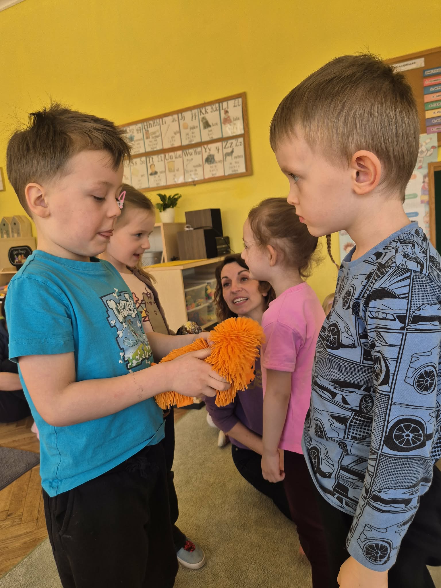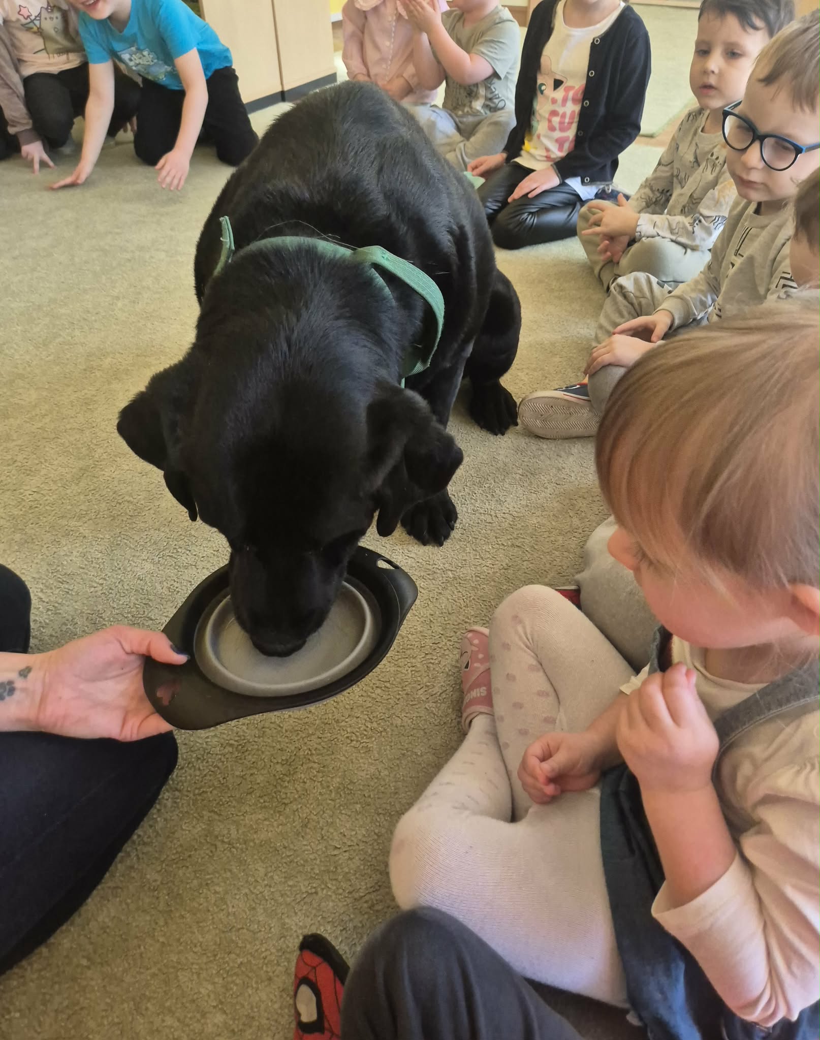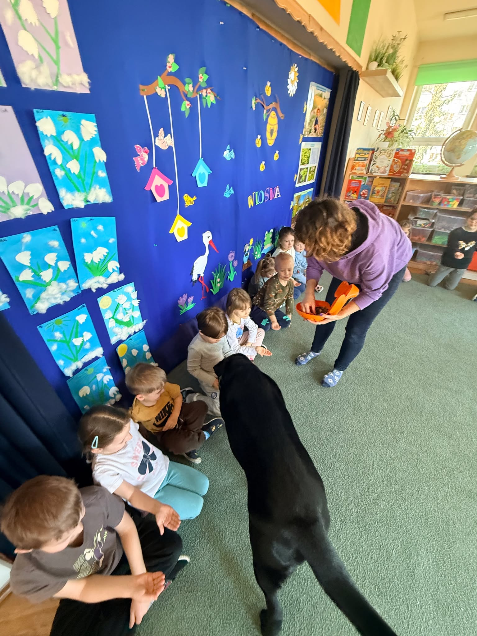 W naszym przedszkolu odbyły się wyjątkowe zajęcia z dogoterapii, które dostarczyły dzieciom wielu radości i niezapomnianych wrażeń. Podczas spotkania przedszkolaki miały okazję poznać specjalnie wyszkolone psy terapeutycznego oraz dowiedzieć się, na czym polega ich praca. W trakcie zajęć dzieci uczyły się, jak prawidłowo i bezpiecznie zachowywać się w obecności psa, jak go głaskać oraz w jaki sposób nawiązać z nim kontakt. Nie zabrakło również wspólnych zabaw, prostych ćwiczeń i zadań, które rozwijały u dzieci empatię, odpowiedzialność oraz wrażliwość na potrzeby zwierząt. Spotkanie z psami terapeutycznymi było dla przedszkolaków nie tylko świetną zabawą, ale także cenną lekcją, która pokazała, jak zwierzęta mogą wspierać rozwój człowieka i pomagać w budowaniu pozytywnych emocji.